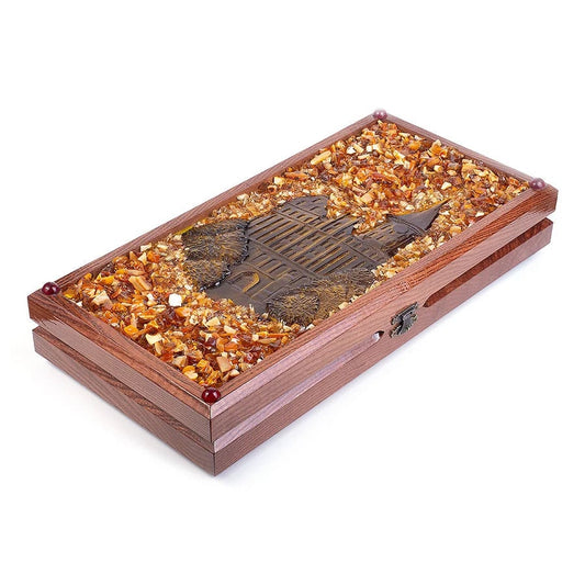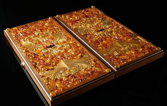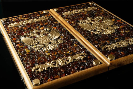 Amber backgammon set "Coat of arms"|wooden high quality board decorated Natural Amber| Amber chips Backgammon Dices| Board Game| Vip Gift